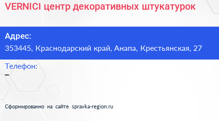 VERNICI, центр декоративных штукатурок по адресу 353445, Краснодарский край, Анапа, Крестьянская, 27 в дальнейшем Организация, размещена в следующих категориях: