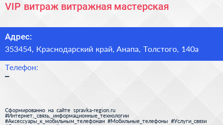 VIP-витраж, витражная мастерская по адресу 353454, Краснодарский край, Анапа, Толстого, 140а в дальнейшем Организация, размещена в следующих категориях: