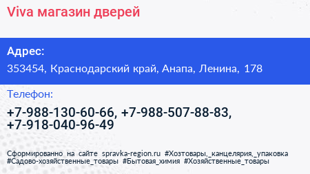 Viva, магазин дверей по адресу 353454, Краснодарский край, Анапа, Ленина, 178 в дальнейшем Организация, размещена в следующих категориях: