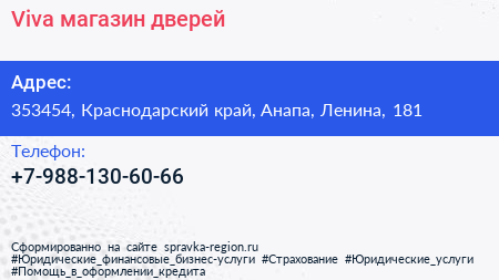 Viva, магазин дверей по адресу 353454, Краснодарский край, Анапа, Ленина, 181 в дальнейшем Организация, размещена в следующих категориях: