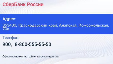 СберБанк России по адресу 353430, Краснодарский край, Анапская, Комсомольская, 70в в дальнейшем Организация, размещена в следующих категориях: