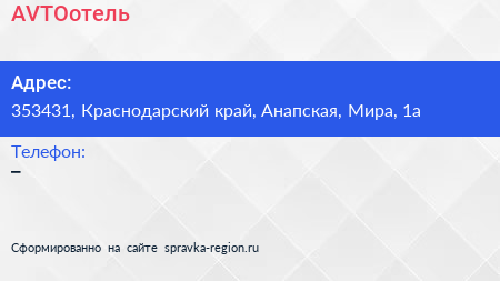 AVTOотель по адресу 353431, Краснодарский край, Анапская, Мира, 1а в дальнейшем Организация, размещена в следующих категориях: