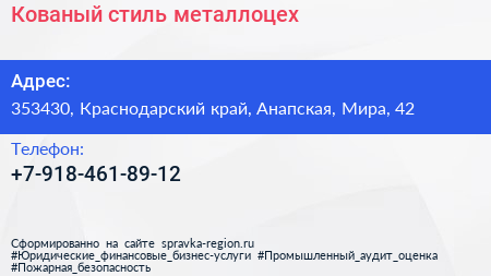 Кованый стиль, металлоцех по адресу 353430, Краснодарский край, Анапская, Мира, 42 в дальнейшем Организация, размещена в следующих категориях: