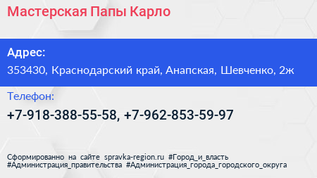 Мастерская Папы Карло по адресу 353430, Краснодарский край, Анапская, Шевченко, 2ж в дальнейшем Организация, размещена в следующих категориях: