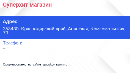 Суперхит, магазин по адресу 353430, Краснодарский край, Анапская, Комсомольская, 73 в дальнейшем Организация, размещена в следующих категориях: