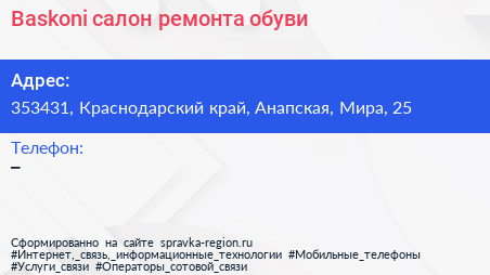 Baskoni, салон ремонта обуви по адресу 353431, Краснодарский край, Анапская, Мира, 25 в дальнейшем Организация, размещена в следующих категориях: