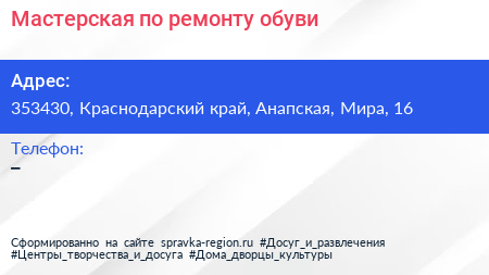 Мастерская по ремонту обуви по адресу 353430, Краснодарский край, Анапская, Мира, 16 в дальнейшем Организация, размещена в следующих категориях: