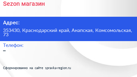 Sezon, магазин по адресу 353430, Краснодарский край, Анапская, Комсомольская, 73 в дальнейшем Организация, размещена в следующих категориях:
