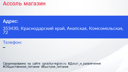 Ассоль, магазин по адресу 353430, Краснодарский край, Анапская, Комсомольская, 72 в дальнейшем Организация, размещена в следующих категориях:
