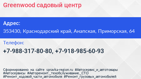 Greenwood, садовый центр по адресу 353430, Краснодарский край, Анапская, Приморская, 64 в дальнейшем Организация, размещена в следующих категориях: