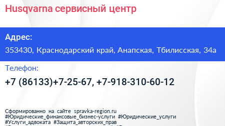 Husqvarna, сервисный центр по адресу 353430, Краснодарский край, Анапская, Тбилисская, 34а в дальнейшем Организация, размещена в следующих категориях: