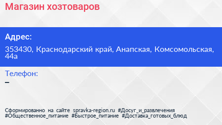 Магазин хозтоваров по адресу 353430, Краснодарский край, Анапская, Комсомольская, 44а в дальнейшем Организация, размещена в следующих категориях: