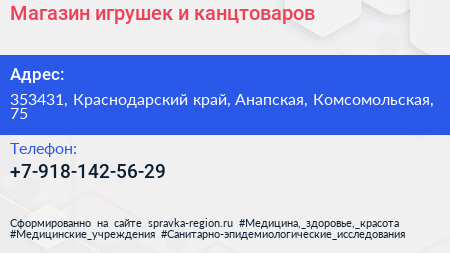 Магазин игрушек и канцтоваров по адресу 353431, Краснодарский край, Анапская, Комсомольская, 75 в дальнейшем Организация, размещена в следующих категориях: