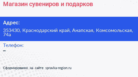 Магазин сувениров и подарков по адресу 353430, Краснодарский край, Анапская, Комсомольская, 74а в дальнейшем Организация, размещена в следующих категориях: