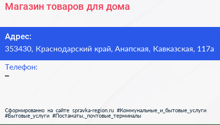 Магазин товаров для дома по адресу 353430, Краснодарский край, Анапская, Кавказская, 117а в дальнейшем Организация, размещена в следующих категориях: