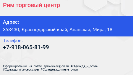Рим, торговый центр по адресу 353430, Краснодарский край, Анапская, Мира, 18 в дальнейшем Организация, размещена в следующих категориях: