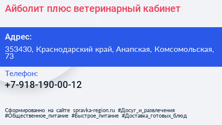 Айболит плюс, ветеринарный кабинет по адресу 353430, Краснодарский край, Анапская, Комсомольская, 73 в дальнейшем Организация, размещена в следующих категориях: