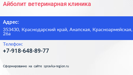 Айболит, ветеринарная клиника по адресу 353430, Краснодарский край, Анапская, Красноармейская, 26а в дальнейшем Организация, размещена в следующих категориях: