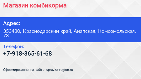 Магазин комбикорма по адресу 353430, Краснодарский край, Анапская, Комсомольская, 73 в дальнейшем Организация, размещена в следующих категориях:
