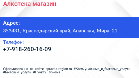 Алкотека, магазин по адресу 353431, Краснодарский край, Анапская, Мира, 21 в дальнейшем Организация, размещена в следующих категориях: