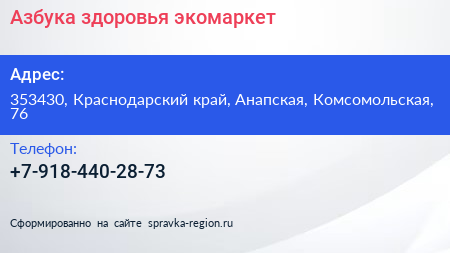 Азбука здоровья, экомаркет по адресу 353430, Краснодарский край, Анапская, Комсомольская, 76 в дальнейшем Организация, размещена в следующих категориях: