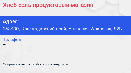 Хлеб & соль, продуктовый магазин по адресу 353430, Краснодарский край, Анапская, Анапская, 82Б в дальнейшем Организация, размещена в следующих категориях: