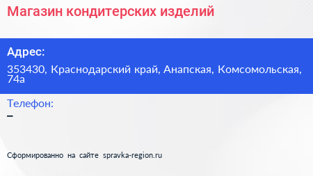 Магазин кондитерских изделий по адресу 353430, Краснодарский край, Анапская, Комсомольская, 74а в дальнейшем Организация, размещена в следующих категориях:
