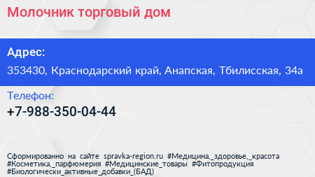 Молочник, торговый дом по адресу 353430, Краснодарский край, Анапская, Тбилисская, 34а в дальнейшем Организация, размещена в следующих категориях: