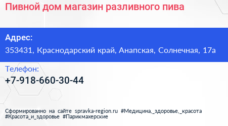 Пивной дом, магазин разливного пива по адресу 353431, Краснодарский край, Анапская, Солнечная, 17а в дальнейшем Организация, размещена в следующих категориях: