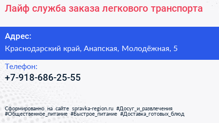 Лайф, служба заказа легкового транспорта по адресу Краснодарский край, Анапская, Молодёжная, 5 в дальнейшем Организация, размещена в следующих категориях: