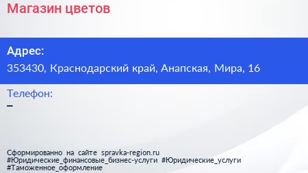 Магазин цветов по адресу 353430, Краснодарский край, Анапская, Мира, 16 в дальнейшем Организация, размещена в следующих категориях: