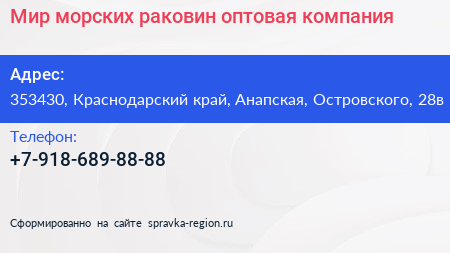 Мир морских раковин, оптовая компания по адресу 353430, Краснодарский край, Анапская, Островского, 28в в дальнейшем Организация, размещена в следующих категориях: