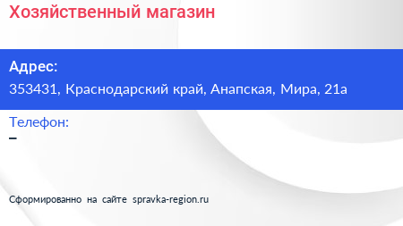 Хозяйственный магазин по адресу 353431, Краснодарский край, Анапская, Мира, 21а в дальнейшем Организация, размещена в следующих категориях: