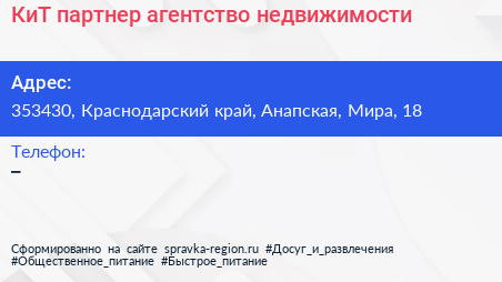 КиТ партнер, агентство недвижимости по адресу 353430, Краснодарский край, Анапская, Мира, 18 в дальнейшем Организация, размещена в следующих категориях: