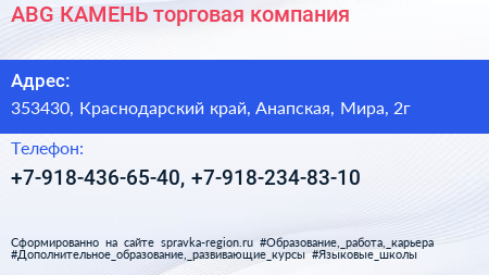 ABG-КАМЕНЬ, торговая компания по адресу 353430, Краснодарский край, Анапская, Мира, 2г в дальнейшем Организация, размещена в следующих категориях: