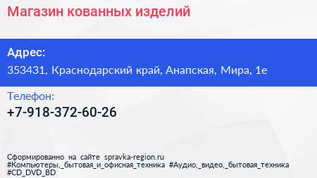 Магазин кованных изделий по адресу 353431, Краснодарский край, Анапская, Мира, 1е в дальнейшем Организация, размещена в следующих категориях: