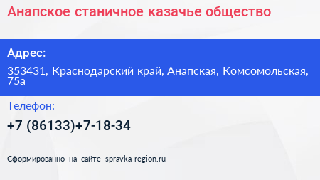 Анапское станичное казачье общество по адресу 353431, Краснодарский край, Анапская, Комсомольская, 75а в дальнейшем Организация, размещена в следующих категориях:
