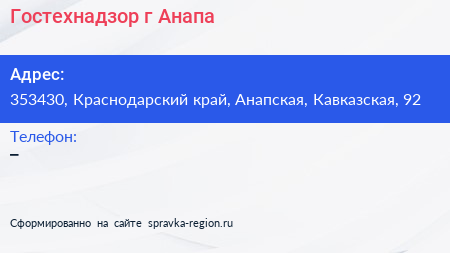 Гостехнадзор, г. Анапа по адресу 353430, Краснодарский край, Анапская, Кавказская, 92 в дальнейшем Организация, размещена в следующих категориях: