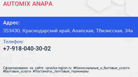 AUTOMIX.ANAPA по адресу 353430, Краснодарский край, Анапская, Тбилисская, 34а в дальнейшем Организация, размещена в следующих категориях:
