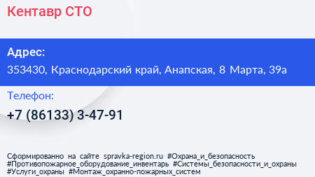 Кентавр, СТО по адресу 353430, Краснодарский край, Анапская, 8 Марта, 39а в дальнейшем Организация, размещена в следующих категориях: