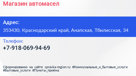 Магазин автомасел по адресу 353430, Краснодарский край, Анапская, Тбилисская, 34 в дальнейшем Организация, размещена в следующих категориях: