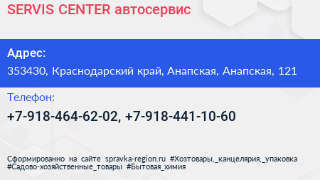 SERVIS CENTER, автосервис по адресу 353430, Краснодарский край, Анапская, Анапская, 121 в дальнейшем Организация, размещена в следующих категориях: