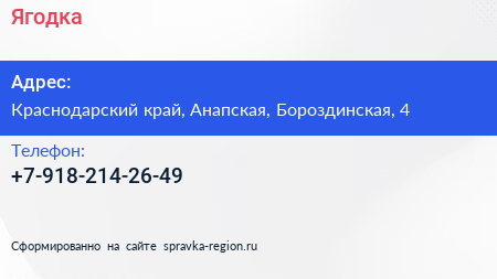 Ягодка по адресу Краснодарский край, Анапская, Бороздинская, 4 в дальнейшем Организация, размещена в следующих категориях: