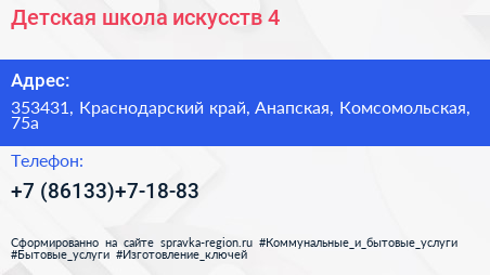 Детская школа искусств №4 по адресу 353431, Краснодарский край, Анапская, Комсомольская, 75а в дальнейшем Организация, размещена в следующих категориях:
