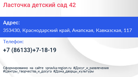 Ласточка, детский сад №42 по адресу 353430, Краснодарский край, Анапская, Кавказская, 117 в дальнейшем Организация, размещена в следующих категориях: