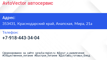 AvtoVector, автосервис по адресу 353431, Краснодарский край, Анапская, Мира, 21а в дальнейшем Организация, размещена в следующих категориях:
