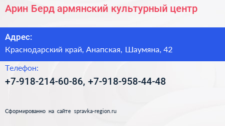 Арин-Берд, армянский культурный центр по адресу Краснодарский край, Анапская, Шаумяна, 42 в дальнейшем Организация, размещена в следующих категориях: