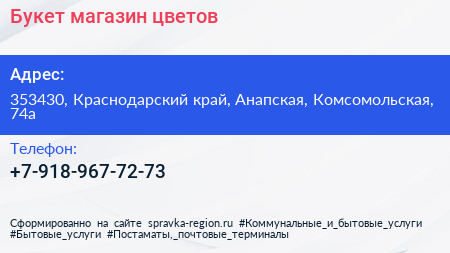 Букет, магазин цветов по адресу 353430, Краснодарский край, Анапская, Комсомольская, 74а в дальнейшем Организация, размещена в следующих категориях: