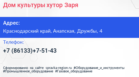 Дом культуры, хутор Заря по адресу Краснодарский край, Анапская, Дружбы, 4 в дальнейшем Организация, размещена в следующих категориях: