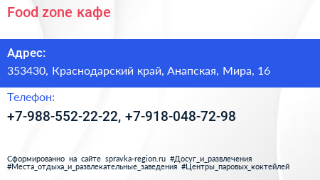 Food zone, кафе по адресу 353430, Краснодарский край, Анапская, Мира, 16 в дальнейшем Организация, размещена в следующих категориях: